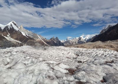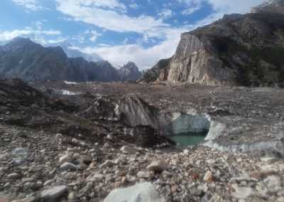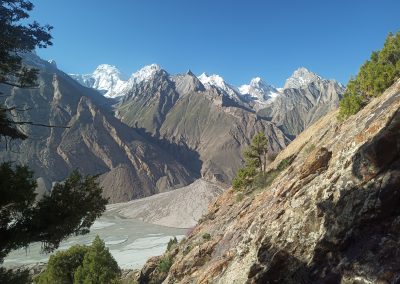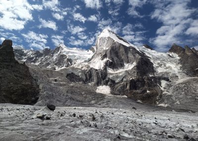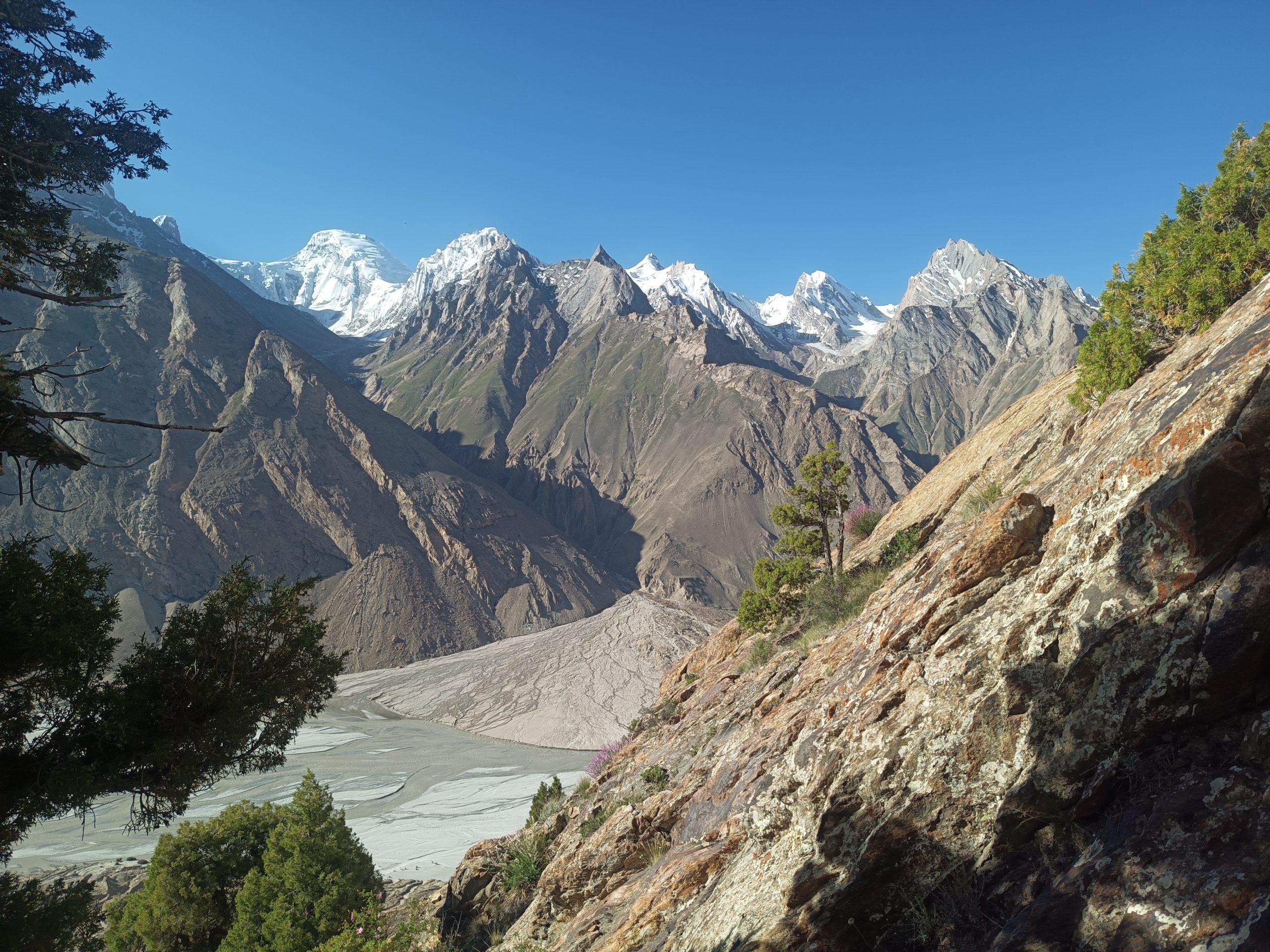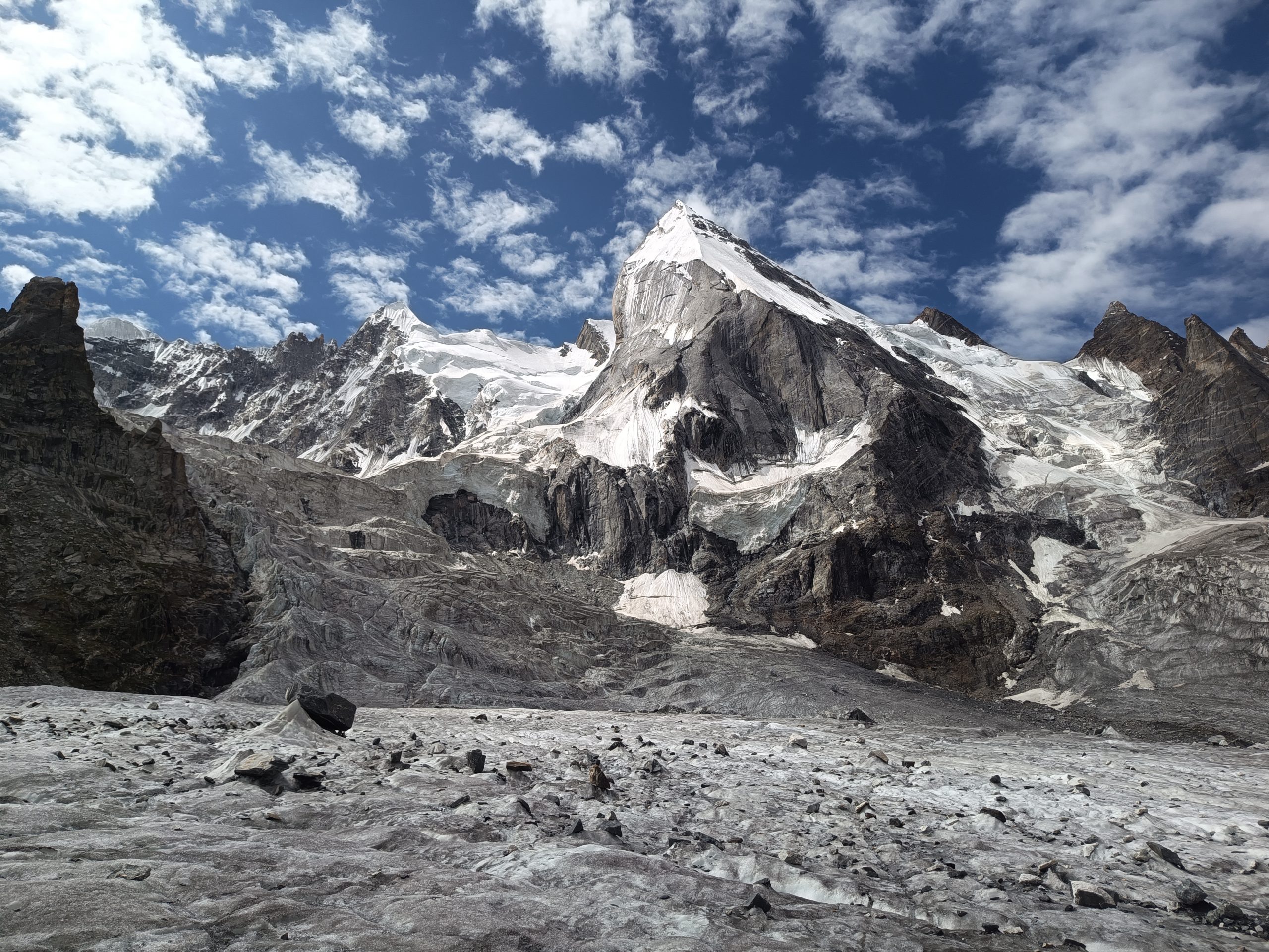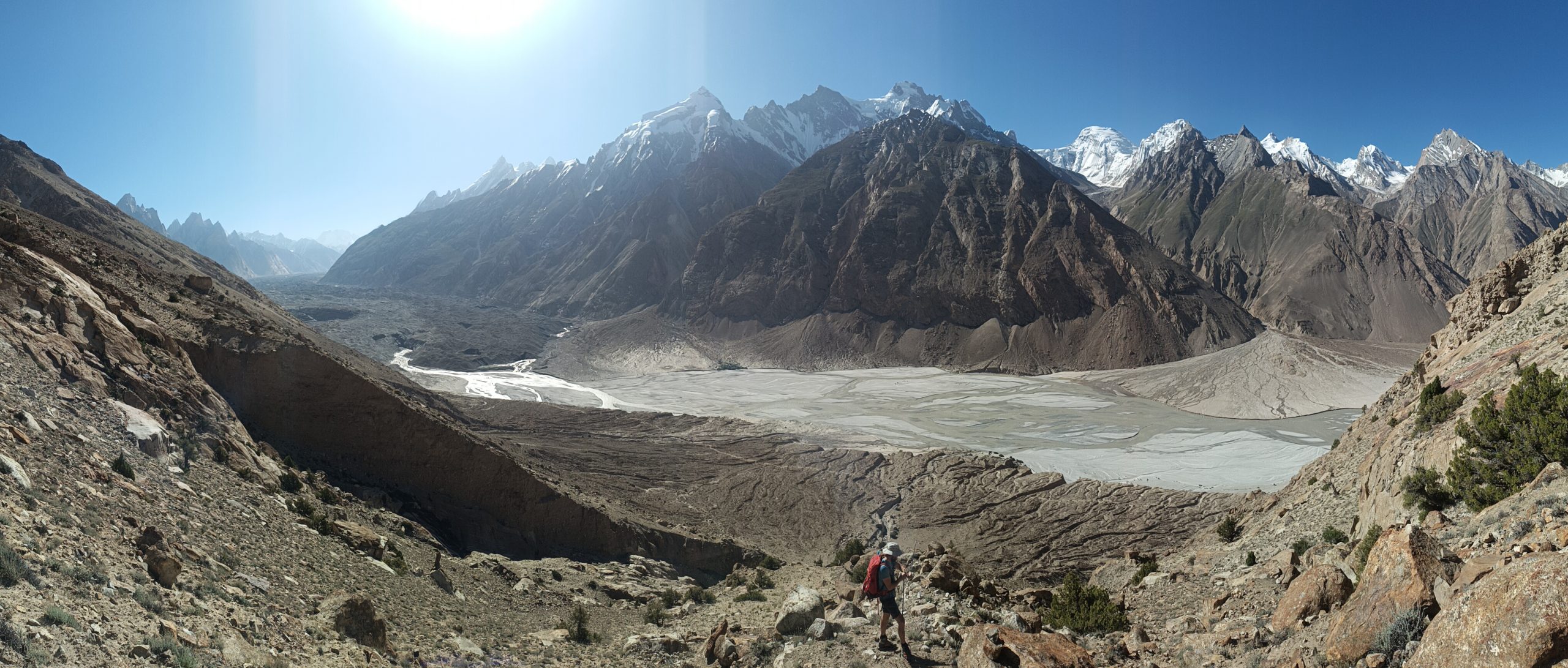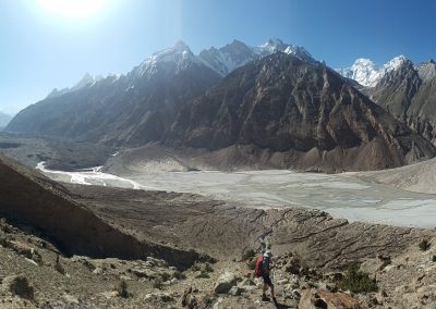 Damit war es aber noch längst nicht vorbei. Der mehrtägige Rückmarsch in die Zivilisation hatte es nochmal richtig in sich. Es galt den besten Weg durch weglose Gletscher zu finden, wilde Gletscherflüße zu überqueren, Eishänge, Schneewände und steinschlaggefährdete Abhänge zu klettern, bevor es dann ruhiger und flacher wurde.
