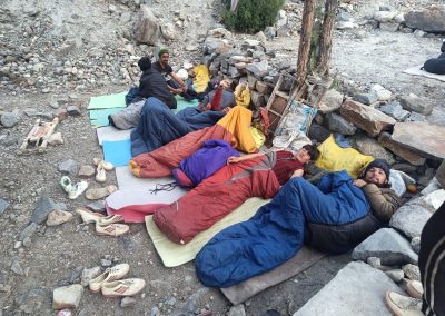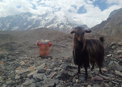 Die Akklimatisierung, also die Gewöhnung an die Höhe, erfolgte innerhalb der ersten zwei Wochen, in der wir das Bergmassiv umrundeten und langsam aber sicher immer höher stiegen. Wer sich schon mal gefragt hat, wie man sich auf diesen Expeditionen verpflegt: Ein Koch samt Kochzelt und Outdoor-Küche versorgt die Truppe. Auf dieser Tour gab es typisch indisch – viel Reis, Gemüse und Kartoffeln.