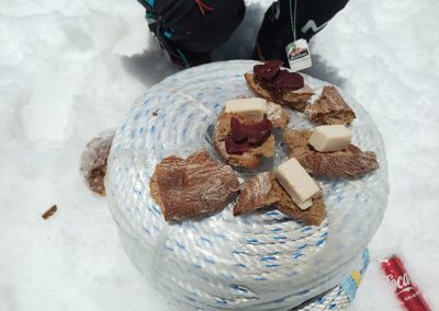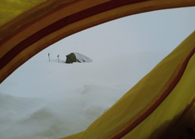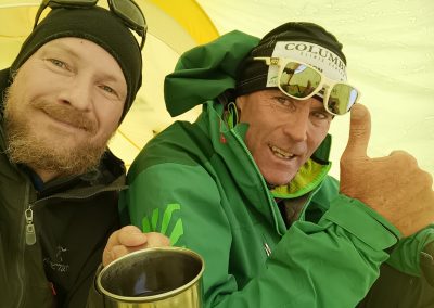 Von dort aus bewegten wir uns in den folgenden Tagen zur Akklimatisierung, also Höhengewöhnzeit, und Materialtransport zwischen diesem und drei Hochlagern: Lager 1, das ‚Plaza Canadá‘ genannt wurde und sich auf 5050 Metern befand, Lager 2, namens ‚Nido de Cóndores‘ auf 5350 Metern und dem Lager 3, ‚Colera‘, auf 5950 Metern Höhe. Das waren zehn lange, kräftezehrende Tage bei minus 20 Grad.