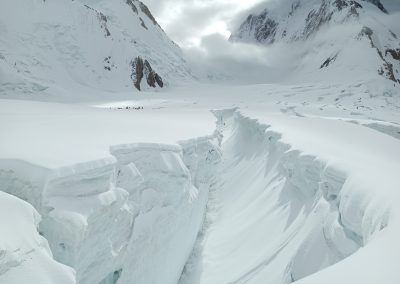 Auf diesen Touren, die auch zum Materialtransport zu den Hochlagern dienen, sind auch schon einige besondere Herausforderungen zu meistern, wie z.B. die vielen Gletscherspalten auf dem Leningletscher. Breite schwarze Löcher und Spalten, über die nur ein schmaler Eissteg führt. Darunter oft 30 bis 40 Meter: nichts.
