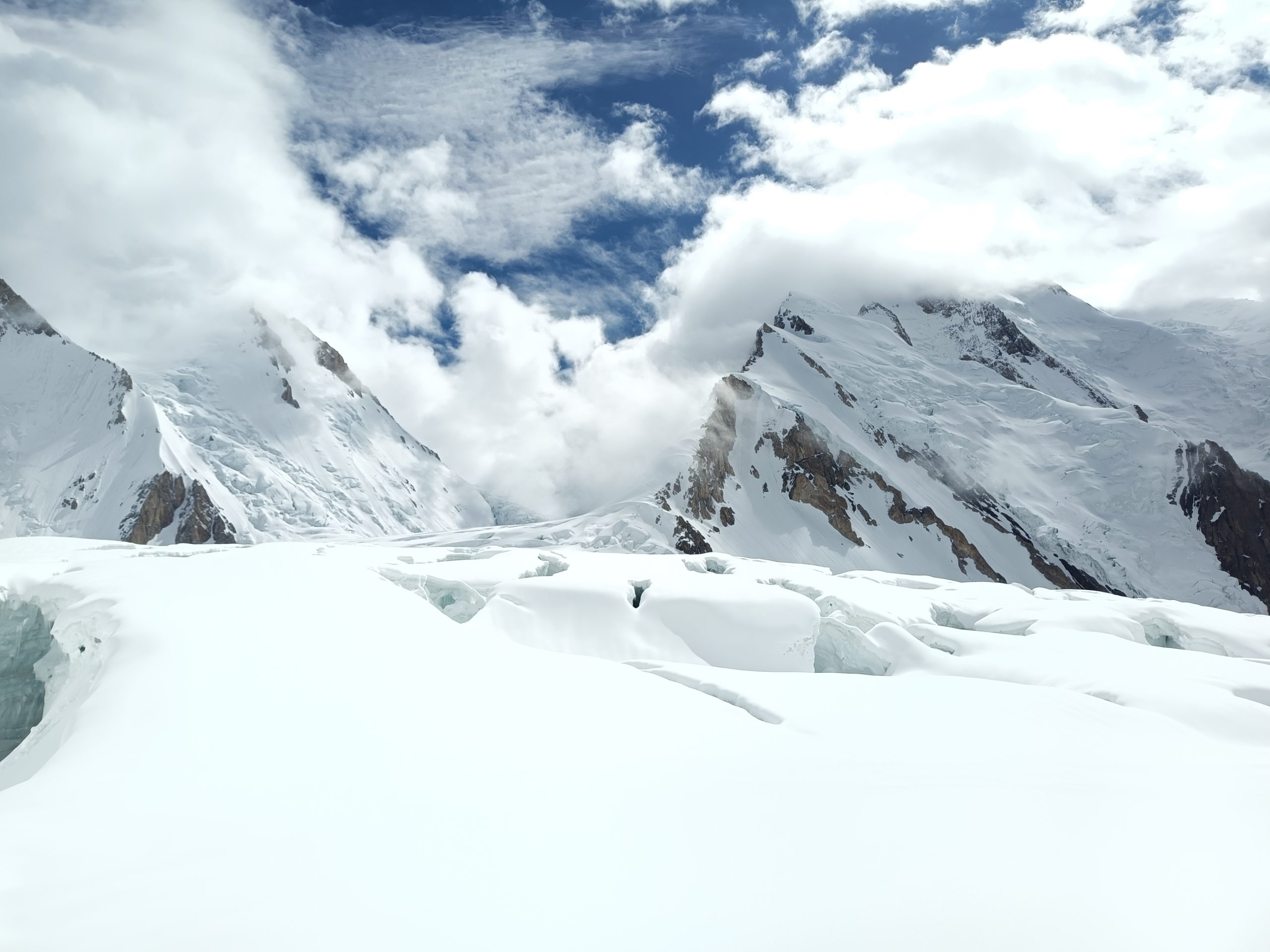 Doch dann schlug das Wetter um. Es begann zu schneien, Tag und Nacht, und hörte trotz anders lautender Wettervorhersagen nicht mehr auf. Sehr untypisch für diese Jahreszeit und Region. Nachdem wir das zweite Mal das Hochlager 1 erreicht hatten, wurden wir dort eingeschneit und mussten mehrere Tage ausharren. Es schneite Tag und Nacht weiter, und die Lawinengefahr nahm stündlich zu. Schließlich kamen sie, die Lawinen, und donnerten Richtung Hochlager. Es war mehr als beängstigend. Mein Kletterpartner und -sherpa hatten irgendwann keine Wahl mehr, und wir beschlossen, den Gipfel aufzugeben und uns irgendwie in Sicherheit zu bringen. Ins Basislager abzusteigen war aber schwieriger als gedacht, weil der Gasherbrum-Gletscher zwischen Hochlager 1 und Basislager zugeschneit war. Dieser ist schon ohne Neuschnee aufgrund seiner vielen Spalten und Seracs sehr kritisch. Mit einem Meter Neuschnee darauf ein Himmelfahrtskommando. Doch uns blieb keine Wahl. In einer 3er-Seilschaft wagten wir den Abstieg. Lawinen rollten weiter auf uns zu. Eine größere verschüttete unsere Spur im Schnee, welche wir 10 Minuten zuvor gelegt hatten.